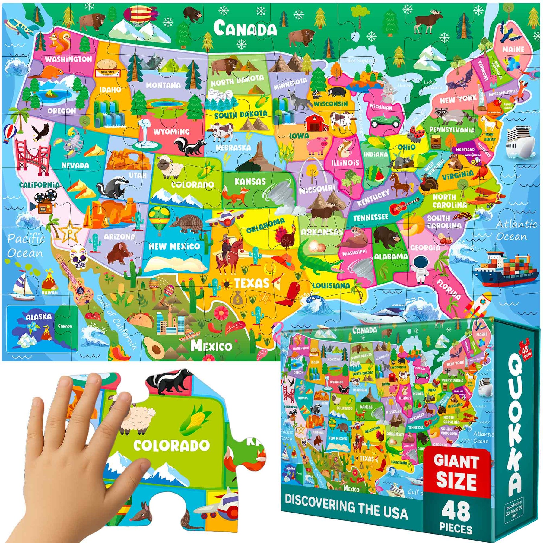 - Giant Floor Puzzle Map USA consists of 48 large pieces.