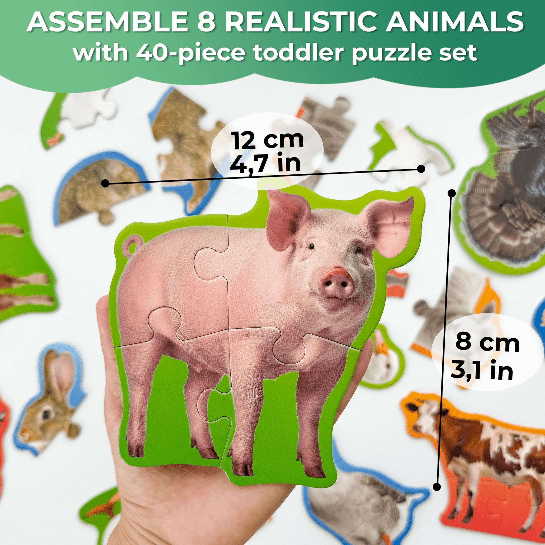 10 ANIMAL SHAPED PUZZLES: Meet 10 farm animals: cow, horse, hare, rooster, pig, sheep, goose, and duck;